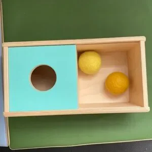 Sliding Top Box with two felt balls. From the Thinker Play Kit for months 11-12.