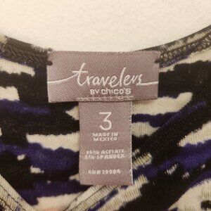 Chico's size 3 in very good condition. Stylish sleeveless wrinkle-free tank top featuring a black and white with speckles of blue and creamy coloring. Perfect for business casual or dressy casual wear with a cardigan and pants or skirt.