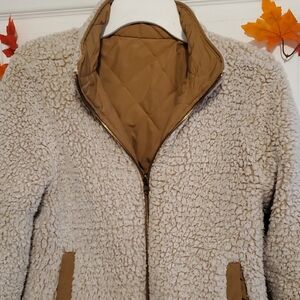 Fall/Winter Chic tan Reversable quilted jacket. Features a warm, soft collar. Includes front pockets and secure zip closure.
