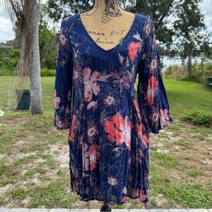 Lightweight! Free People Eyes On You Navy Floral Boho V-Neck 3/4 Sleeve Dress
