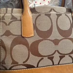Stylish brown and tan Coach handbag featuring a chic bow accent. Perfect for any occasion. The bag has several marks (see photos) but has never been cleaned. The bow can also be removed.