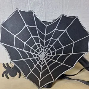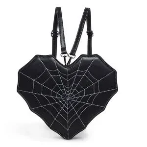 Features: Spiderweb Design, Heart Shaped, Adjustable Straps, Black Color, White Stitching, Gothic Style, Spider Charm