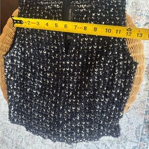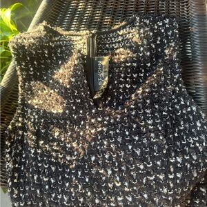 Classic St. John Collection Tweed Pattern black and white Midi Shift Dress. Size 2. Sleeveless with a V neck, concealed zip closure at back. Ideal for elegant occasions. Pair with black heels and handbag for a refined look.