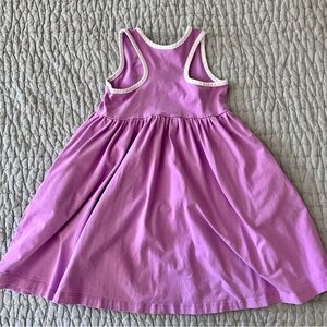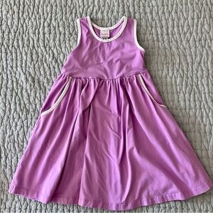 Lot of two dresses from Hanna Andersson. The first is a floral sleeveless dress with pockets. Overall in great condition with color fade due to wash wear. The second is a purple racer back sleeveless dress with white piping and pockets— a great twirling dress! This in great condition though I have just noticed a light spot on the hem (see ohoto)- certainly possible it could come out. Both have been lightly worn by one child.