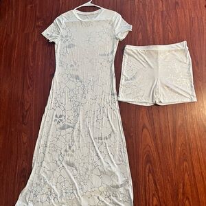 Stylish white and metallic print two-piece set with tie-front detail. Perfect for a chic look. Can be tied or let loose depending on preference.