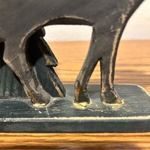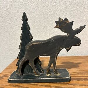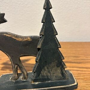 It is a little over 6" tall at the tallest, almost 6" at the longest. It is made of a light wood, made to look aged, Moose is aged black and treee is a very dark green.The glue around hooves and tree (see pictures) I think may have always been there but not sure. It is in otherwise very good condition Add a touch of rustic charm to your home with this black moose and tree decor piece. Perfect for holiday settings or year-round display.