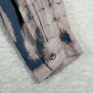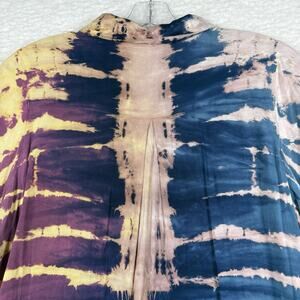 The Mono B Tunic Shirt Dress is a stylish and versatile piece for women in size L. This knee-length dress features a colorful pink, brown, and blue tie-dye pattern, making it perfect for various occasions such as travel, parties, casual outings, or even business meetings. With a collared neckline and long sleeves, this pullover shirt dress is made from lightweight rayon fabric, easy to care for with a hand wash. The brand and style of this dress evoke a beachy, hippie, and tropical vibe, adding a fun and vibrant touch to any wardrobe.