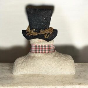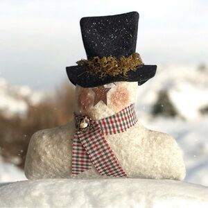 Charming and rustic, this hand-crafted snowman decoration features a black top hat and a red plaid scarf. Perfect for holiday decor.