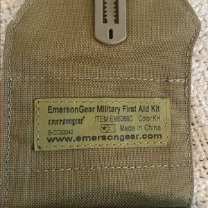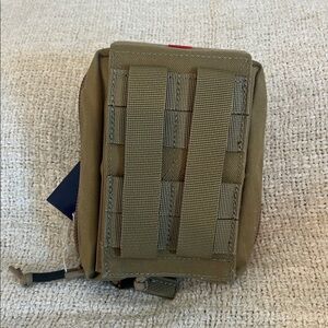 Tactical first aid pouch in olive green with a red cross. Includes a tourniquet and medical supplies. You can also use it for your first aid kit. It's great to keep in your car or travel.