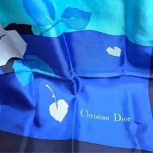 Elegant CHRISTIAN DIOR scarf with blue light and dark colors. floral leaf design. Luxurious 100% silk