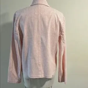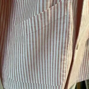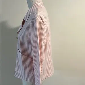 Stylish pink striped blazer with double-breasted design. Features classic lapels and front pockets.