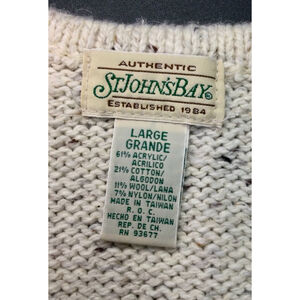 This is vintage a pre-owned St. John's Bay vest, size Large. It features a full zip closure and a V-neck design. The vest is made of a blend of 61% acrylic, 21% cotton, 11% wool, and 7% nylon. The color block pattern includes cream, olive green, and yellow. The vest measures approximately 23 inches in length and 20 inches in width. There are no visible stains or tears. In excellent vintage condition