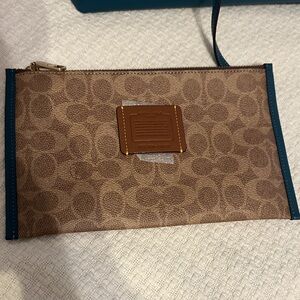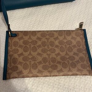 Coach tote in deep teal. In great condition, it’s close to being new. Has a snap closure and comes a pouch. There are no pockets inside nor outside. It’s a large bag that can hold a lot of items.