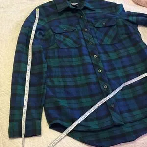 Great heavyweight cotton flannel in a classic blue/green/black plaid pattern from Duluth Trading Company. Two front button pockets on the chest and button cuffs. Gusset underarms for additional flex.