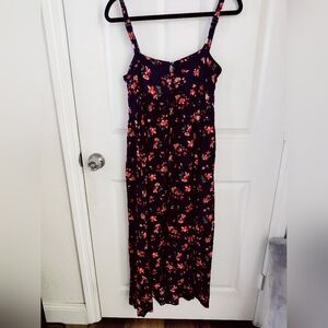 Charming floral maxi dress by NATURAL LIFE. Features a navy base with vibrant orange floral patterns. Perfect for casual outings.