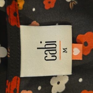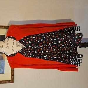 Elegant black blouse featuring red and white floral design. Perfect for any occasion. Sleeveless cuffs have a jersey material, striped design for a fun twist. Buttons down. Cardigan is also available in my closet. Like new! 21 inches across the bust and approximately 28 inches long.