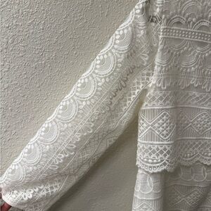 Sezane white midi dress with intricate lace pattern, three-quarter sleeves, and a row of buttons along the back. I purchased from another resell site from someone who only wore it once, and I never wore it. While it’s a beautiful dress, it’s too big on me.