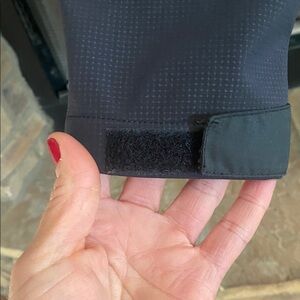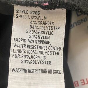 Five Fifty Five black and silver ski jacket with detachable fur hat with Velcro and drawstrings to adjust fit. Bottom of jacket also has drawstrings to adjust fit. Jacket has 2 zippered pockets in front and 1 zippered pocket by the chest. Please note last picture shows middle snap button missing. Large. Approximate measurements are 21 pit to pit and length from shoulder is 24.