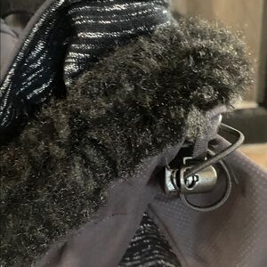 Black and silver ski jacket with detachable fur hat and zippered pockets. Large