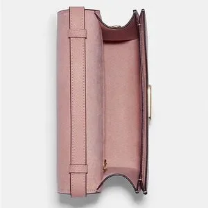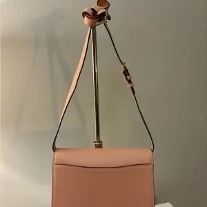 Elegant pink crossbody bag. Features gold-tone logo. Stylish and versatile.