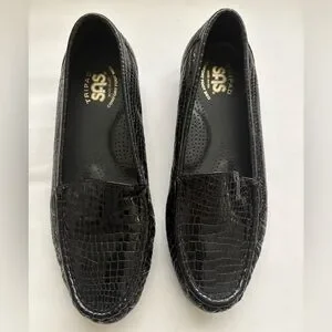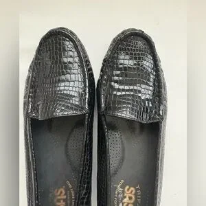Keywords: SAS shoes, comfort loafers, orthopedic shoes, black leather slip-ons, croc embossed flats, Tripad shoes, made in USA shoes, women’s size 7.5