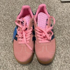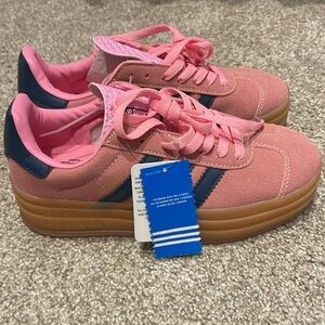New with tags adidas shoes. Style is called gazelle bold. Size 6.5. Color is called pink glow victory blue gum. No box. Sold out online. Rubber sole suede for the rest. Lace up.