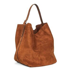 •Inner clasp fastening •Adjustable belt-style suede shoulder strap with metal buckle •Interior: one main compartment, two slip pockets; resin-coated interior •Silver-toned metal hardware •Suede design •34 X 37 X 27 cm; shoulder strap drop (at middle hole): 29 cm •Tan color •100% Leather •Made in Italy