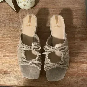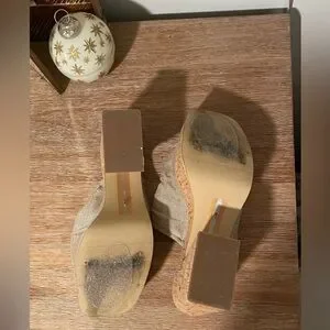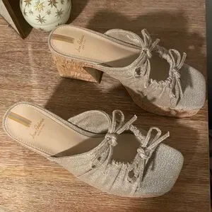 Chic cork platform sandals with a textured beige upper. Features a bow detail and shimmer for added elegance. Only worn once!
