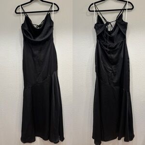 Sleek black maxi dress. Spaghetti straps. Open back with tie detail. Perfect for evening wear.