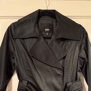 NWT Sleek black trench coat with a timeless design. Features a belt with silver tone hardware. Perfect for versatile styling.