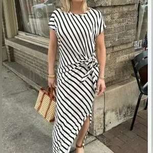 Chic black and white striped maxi dress. Features a stylish tie detail at the waist.