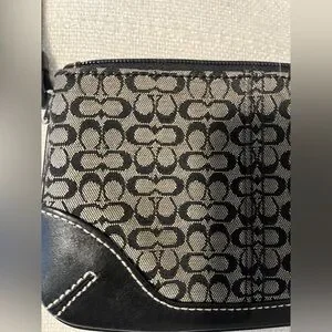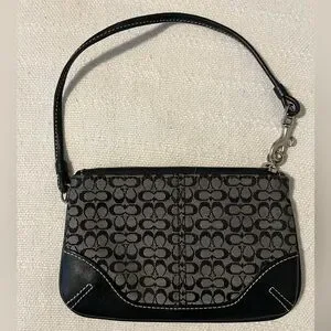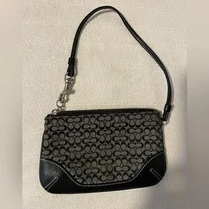 Stylish Coach wristlet with signature pattern. Features zipper closure and black leather accents. Ideal for versatile use.