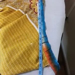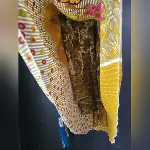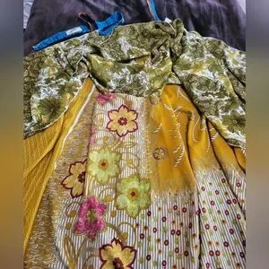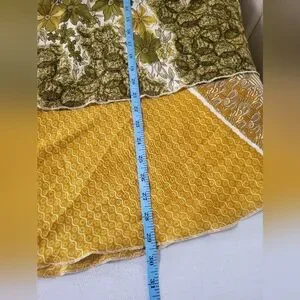 This vibrant midi skirt combines a playful asymmetrical, tiered design with a striking yellow and green color palette. Perfect for casual or resort wear, its A-line silhouette offers a graceful flow and comfortable fit. The medium-weight fabric ensures it drapes beautifully, making it a versatile addition to any wardrobe. can be worn on both sides.