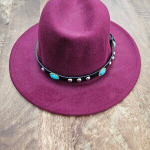 Fedora Style Hat Womens Burdundy Felt Western Turquoise Silver Accents