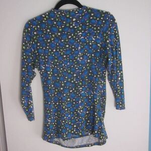 Top is mostly blue and green with cream, yellow and purple accents.