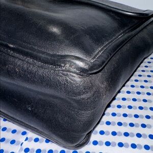 Vintage COACH #9927 "Willis Bag" Brass hardware with turnlock closure. Full-length outside back pocket. Full-length front pocket under flap. Full-length inside zipper pocket. 48" Adjustable shoulder strap detaches. Rubbing on corners (ref. to photos) tore on handle, inside need some cleaning. It’s in good vintage condition