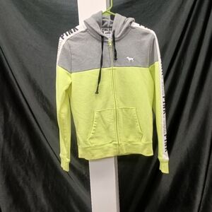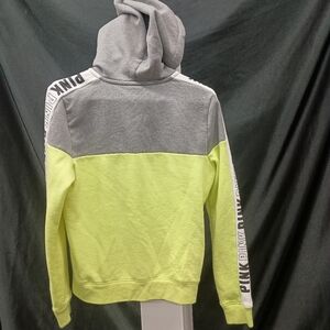 Cozy gray hoodie with black drawstrings. Features PINK logo.