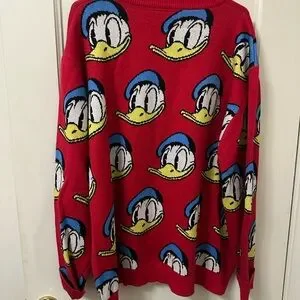 Bright red cardigan featuring Donald Duck pattern. Fun and iconic style for Disney fans.