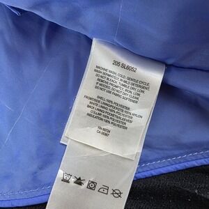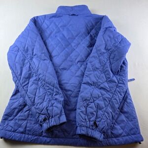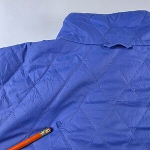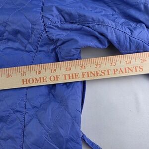 Periwinkle diamond-quilted jacket from Columbia. Features a full zip closure, black fleece-lined collar, and a vertical zippered chest pocket. Includes adjustable waist ties and the brand's name subtly embroidered near the bottom hem. It's ideal for outdoor activities such as hiking and camping, as well as everyday casual wear during the transitional seasons.