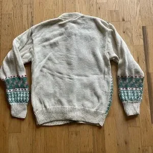 This Orvis cardigan sweater showcases a delightful blend of cream and green hues, adorned with intricate Nordic patterns. Its medium to heavy knit offers warmth and style, making it a perfect choice for cozy winter days. The festive design adds a touch of holiday charm to any wardrobe. Good used condition.