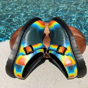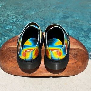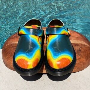 Vibrant mules with a bold multicolor design. Features a secure strap and durable sole.