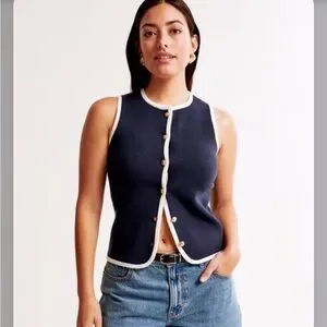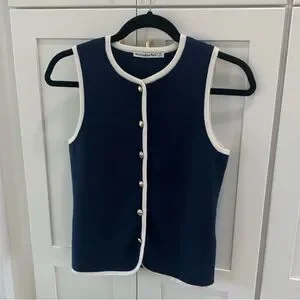 Stylish navy blue button down shirt. Features white trim and button details. Sleeveless design for versatile wear.