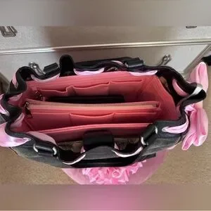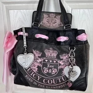 Juicy Couture pink and gray twig dog vintage daydreamer along with pink and gray juicy wallet. Also includes a pink bag insert to help protect the interior from further peeling. This bag is authentic vintage and has some signs of wear. Could use some cleaning on the exterior.