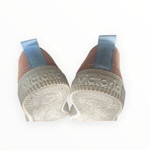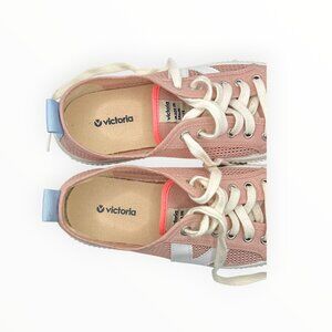 Step into effortless style with these lightweight Victoria sneakers — soft pink mesh uppers, white “V” logo, and sky-blue heel detail.
