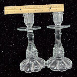 Antique Clear Glass Candle Stick Holder Set 2 Tapper Glass Manganese UV Green
