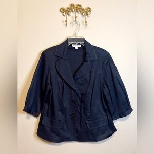 Chic black shirt sleeve blazer by Studio I. 3 button closure with 2 faux pockets. Belt loops (no belt included) Perfect for any occasion. 97% cotton 3% spandex