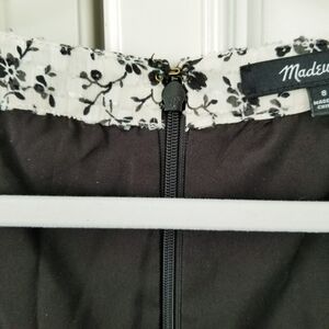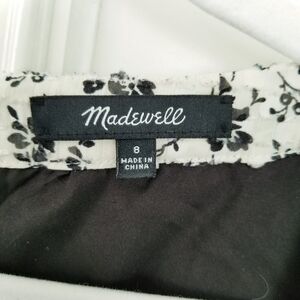 Madewell black/off white branch floral swiss dot chiffon lined midi dress size 8. Fabric covered buttons on upper front. Waist is gathered. Closes with zipper on back. Very good condition. No damage or stains.