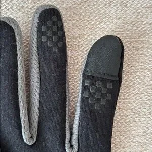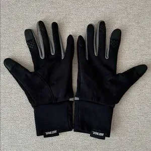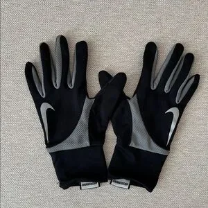 Nike sports gloves in black and gray. Features iconic swoosh logo. Tiny tear sewn up barely visible. Great gloves with smartphone fingertips.