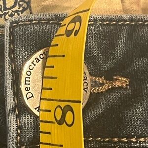 Democracy Stylish boot cut jeans. Dark blue hue. Perfect for versatile wear. Flat lay 15” rise 9” inseam 30. Size 8