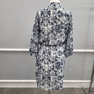 Stylish Vince Camuto midi dress. Features a blue and white pattern. Perfect for any occasion.